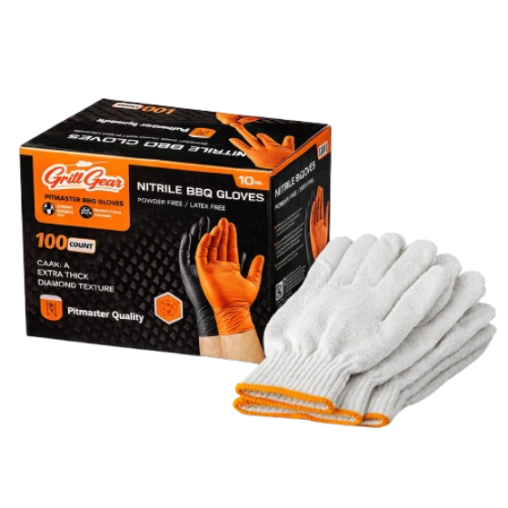 Grill Gear 10-mil nitrile BBQ gloves offer heavy-duty durability and heat protection, paired with heat-absorbing cotton liner gloves and a non-slip grip for confident handling at the grill.