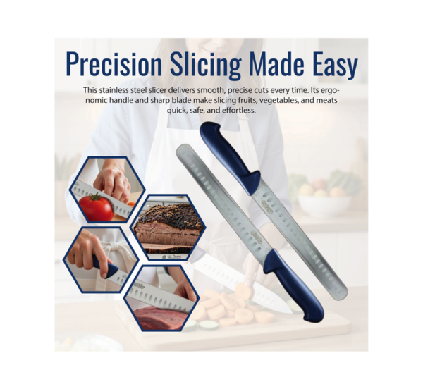 The 12″ Granton Slicer replaces shorter knives that struggle with large cuts. One clean tool handles demanding tasks.