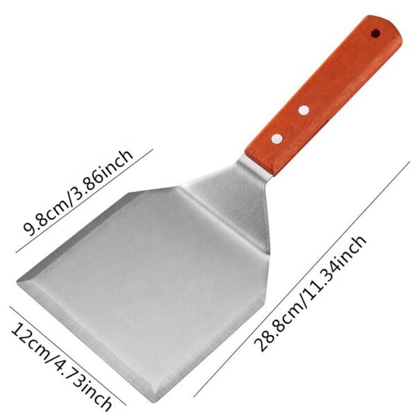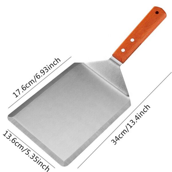 The 2 Piece Set Stainless Steel BBQ Griddle Pan Cooking Spatulas includes two practical sizes, 5.35″x13.4″ and 4.7″x13.4″, for different cooking tasks. Use the wider spatula for burgers and pancakes. Choose the narrower spatula for precision work and basting.