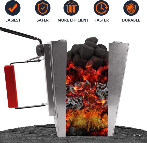 The BBQ Grill Chimney Starter Outdoor BBQ Grill features a smart collapsible design that saves space during transport. Strong airflow ignites charcoal quickly without lighter fluid. Coals heat evenly for consistent grilling performance.