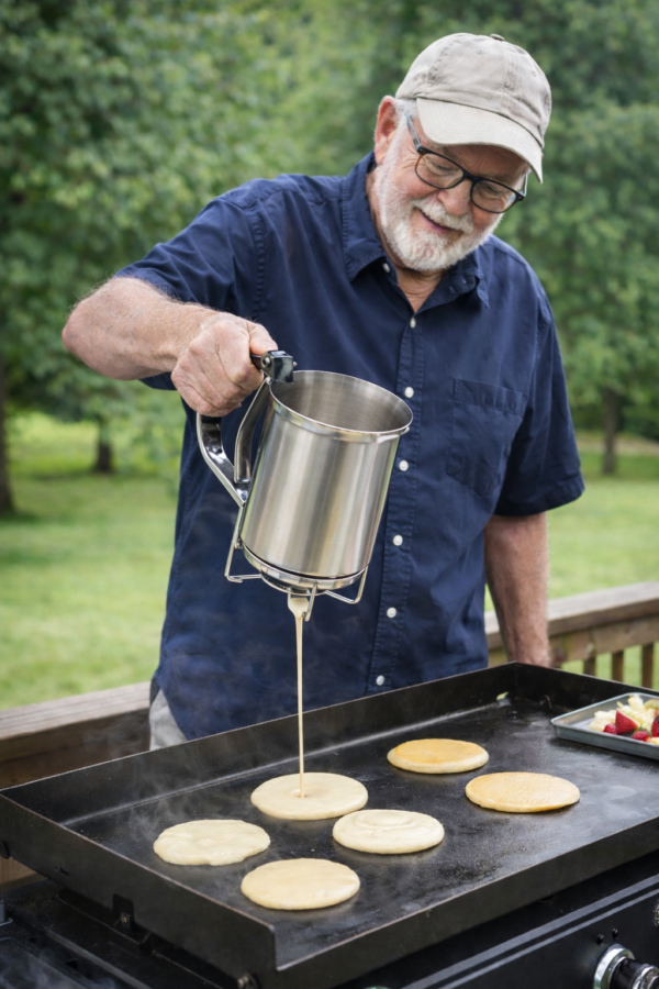 The Stainless Steel Griddle Pancake Batter Dispenser delivers clean, controlled pouring for perfect pancakes every time. This handheld tool improves accuracy on outdoor griddles and flat tops.